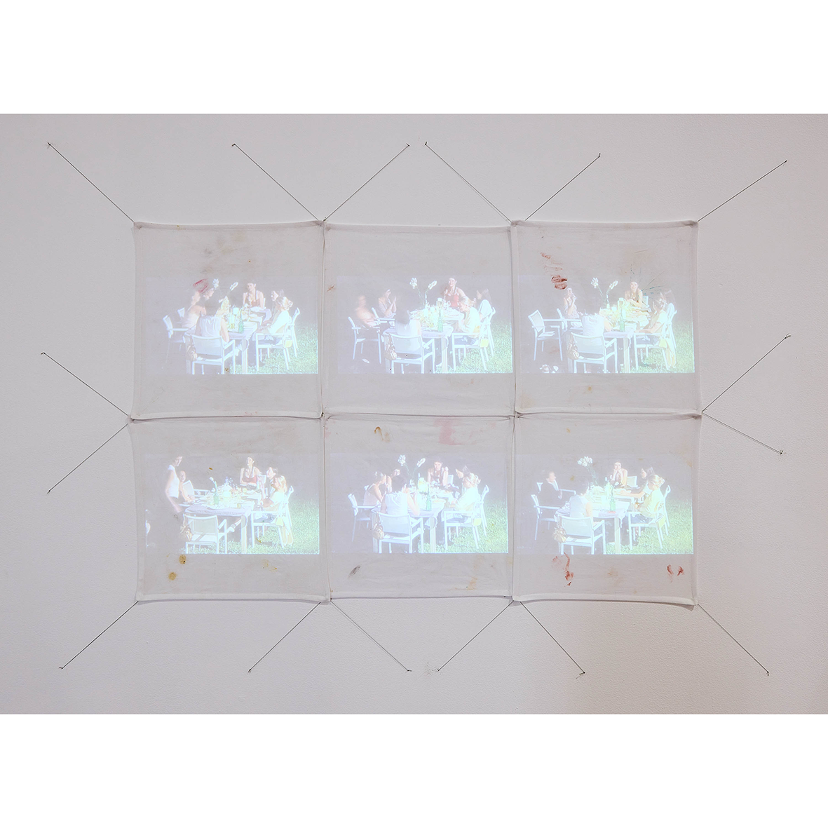 food remnants, lipstick, ash, hair, single channel film on cotton napkins, silent, 8:13 min