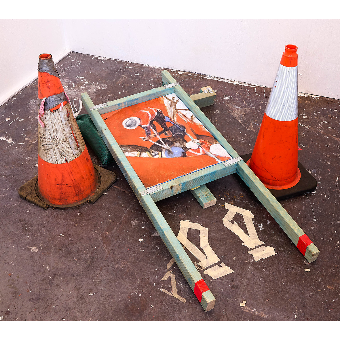 synthetic polymer paint on canvas, blue pine, nail plates, sandbags