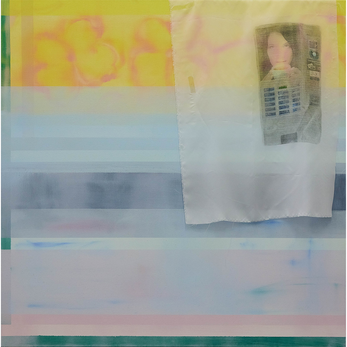 oil, synthetic polymer paint, fabric image transfer on canvas